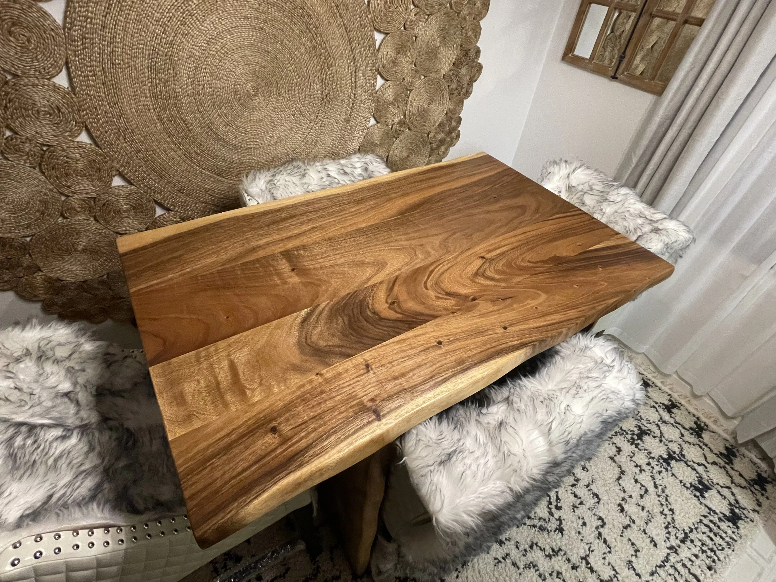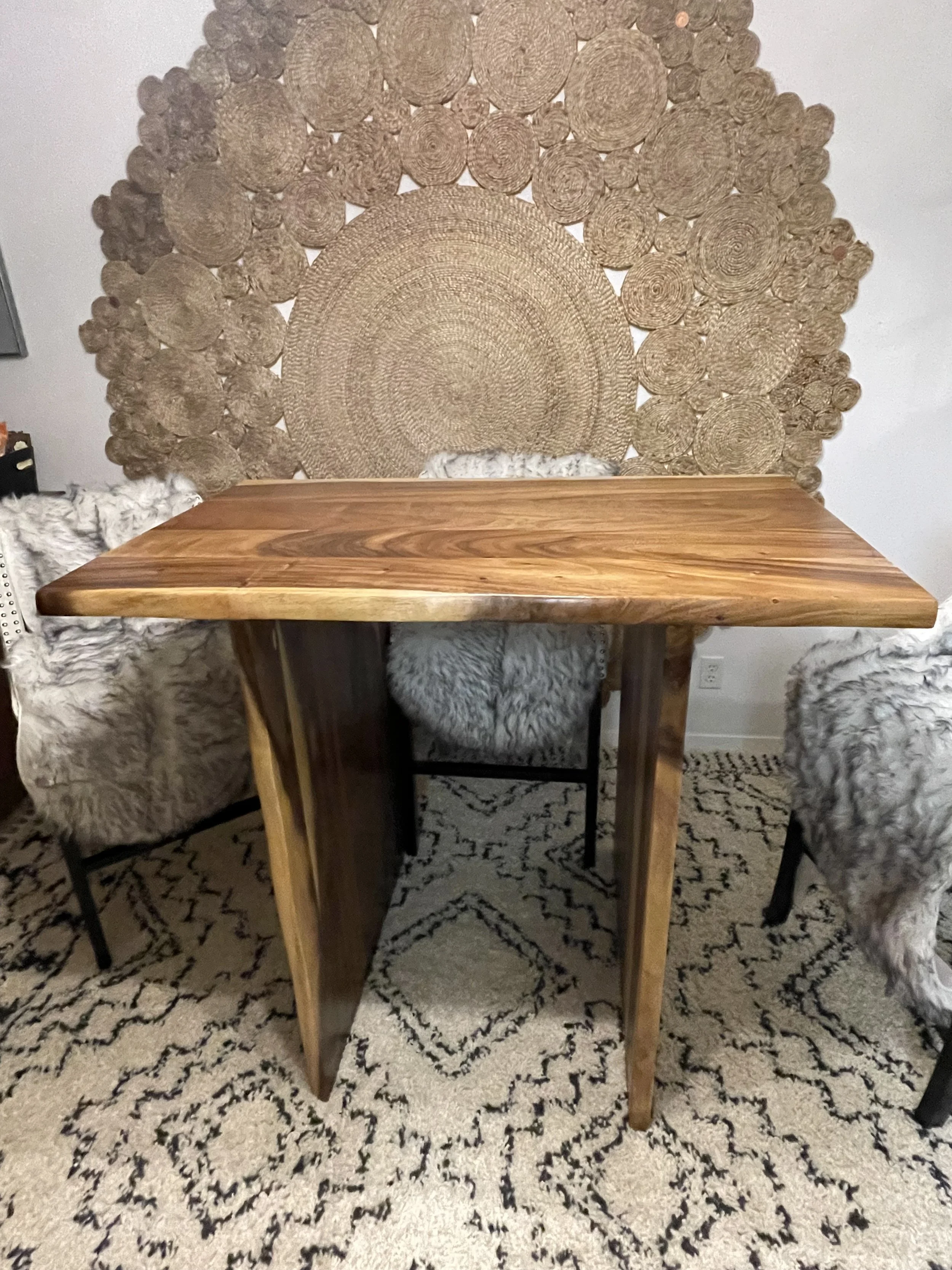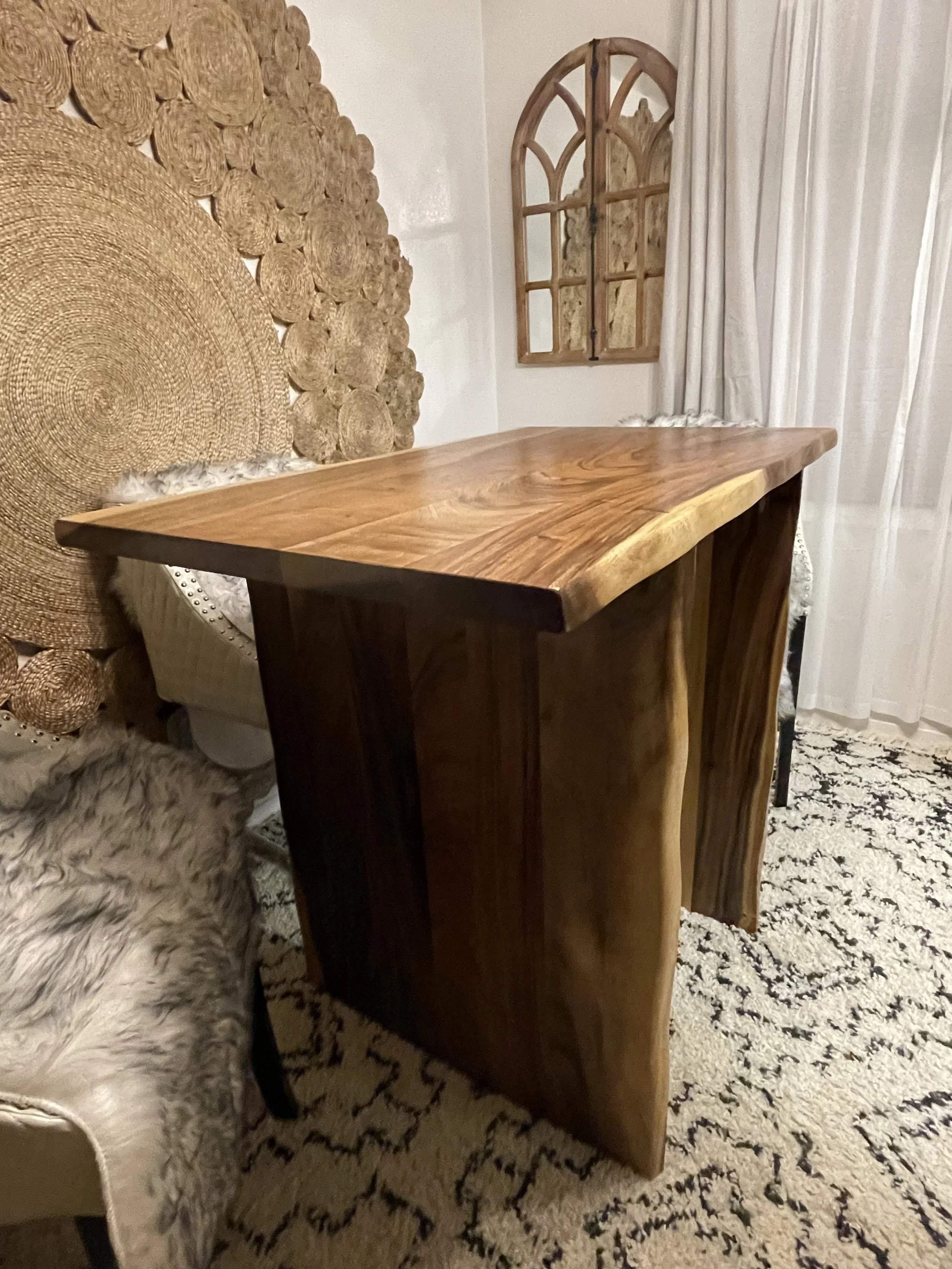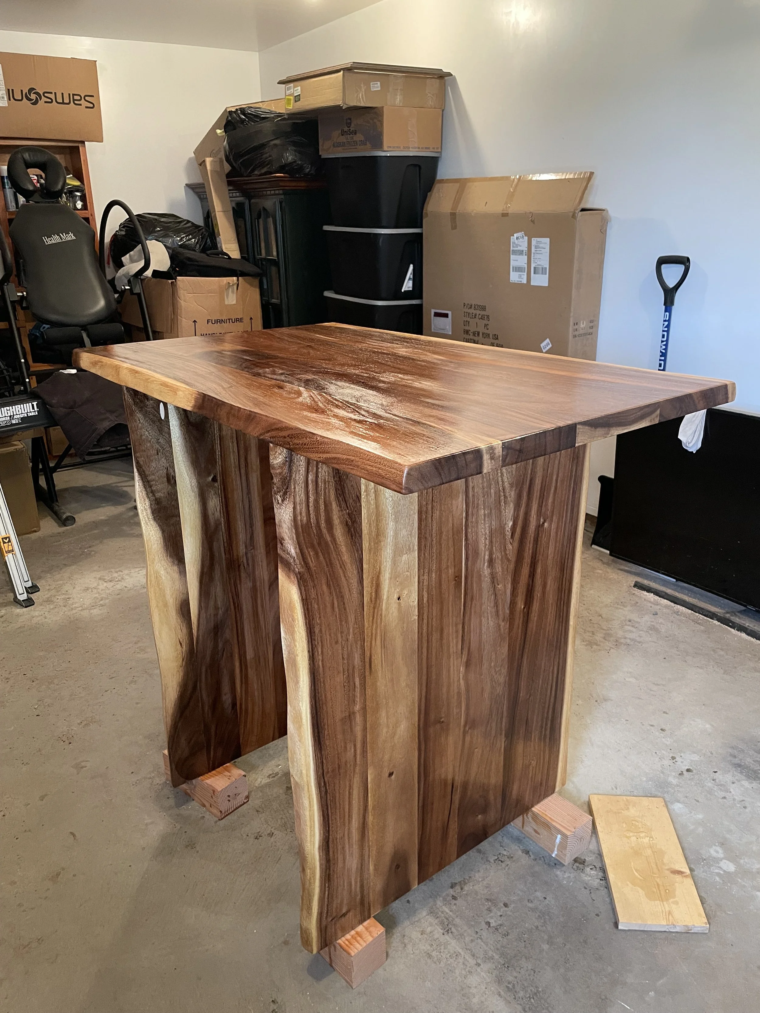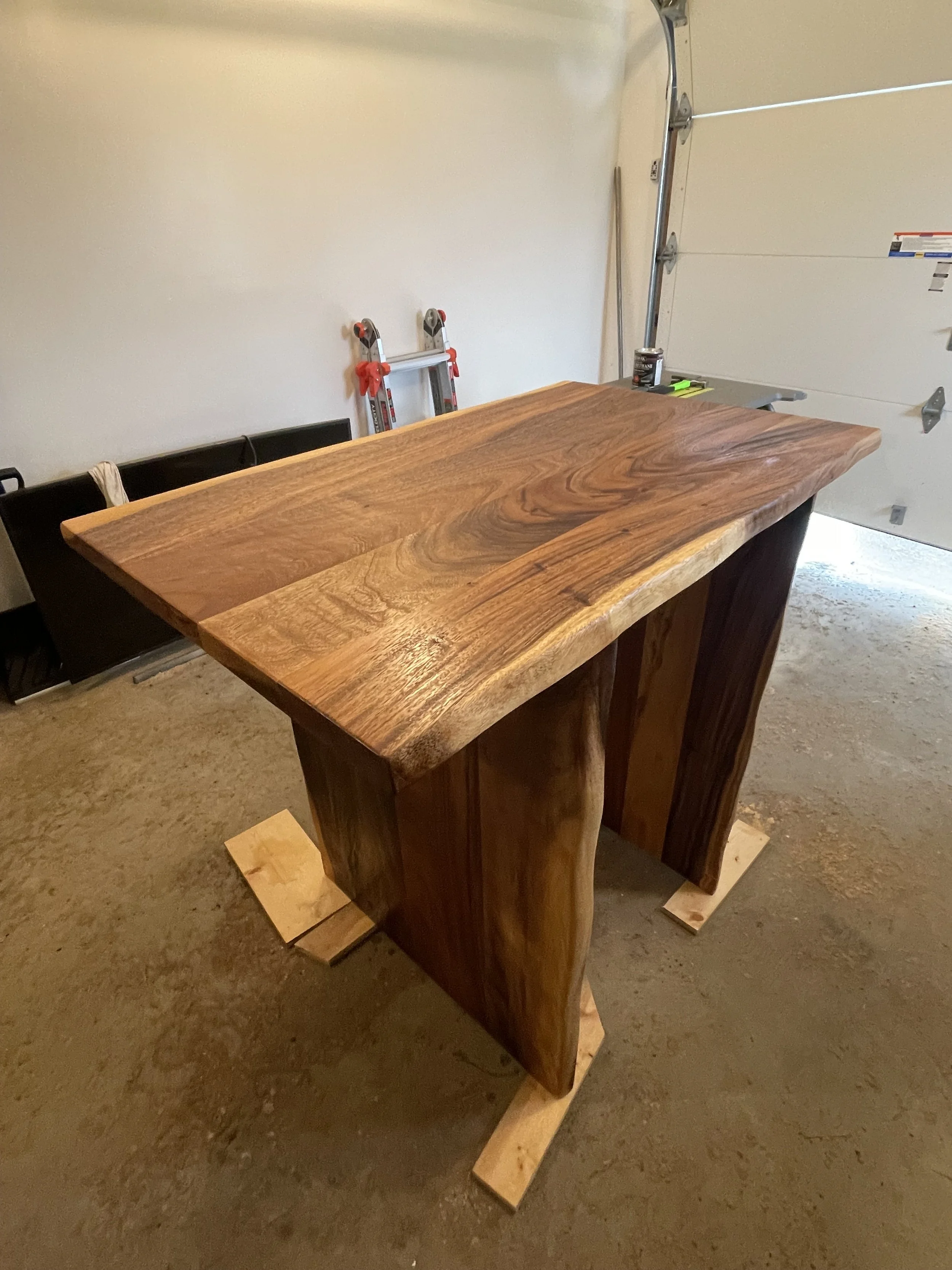 A beautiful dining table made from live edge Saman wood. This table is elegant enough to be the centerpiece of any room it sits in, yet built to withstand the abuse of years worth of family dinners and game nights. The live edge continues down the panel legs, creating a unique and custom look. This was truly a pleasure to create!